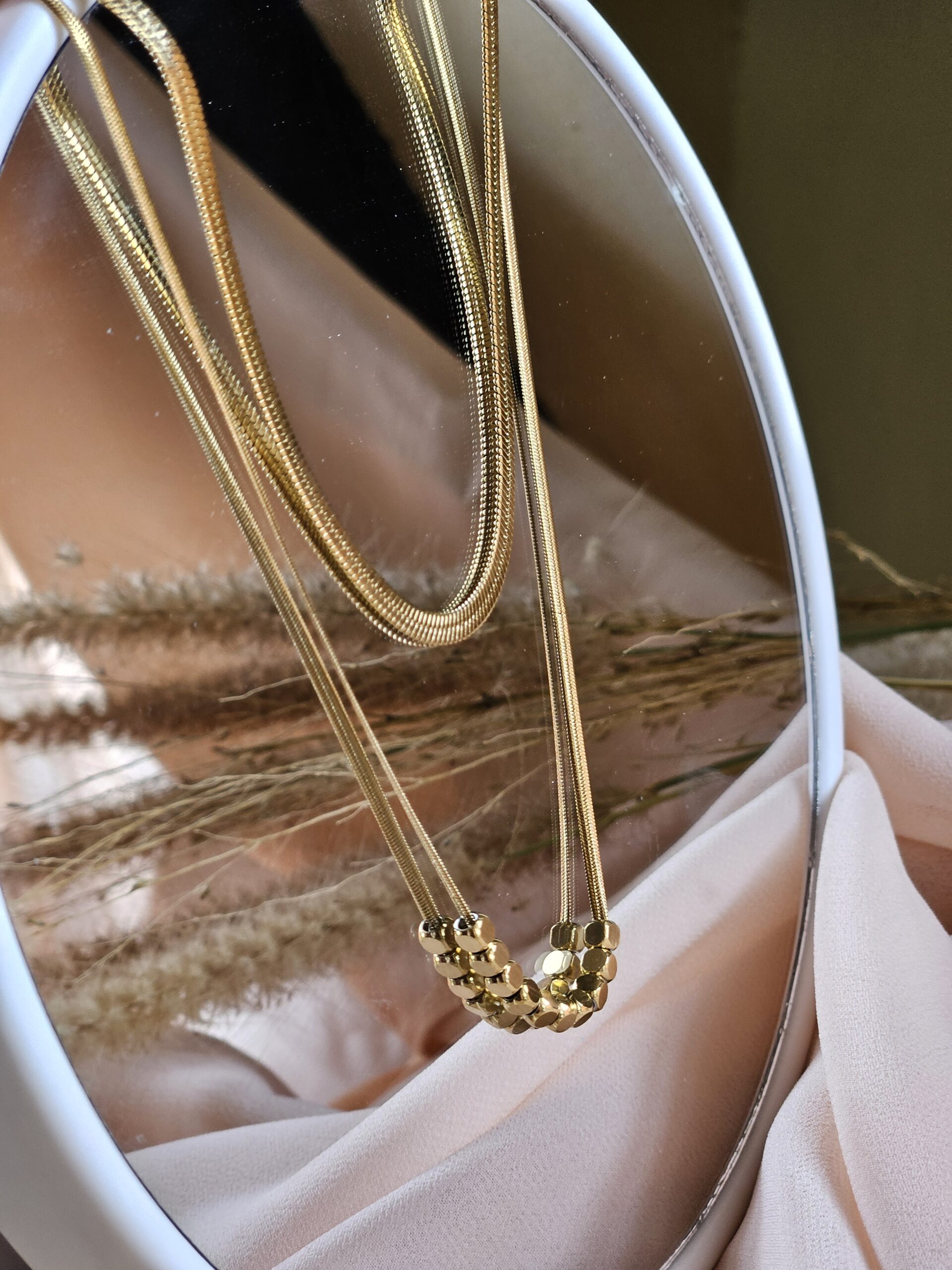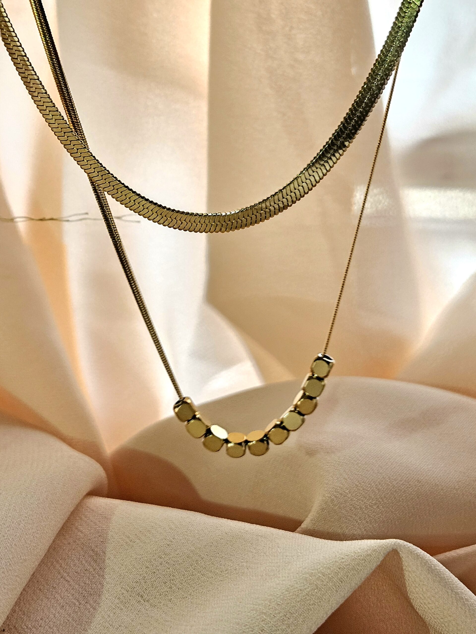 This elegant double-layer snake chain necklace features two intricately designed strands that sit beautifully against the skin. The smooth, sleek design of the snake chains catches and reflects light, creating a captivating shine with every movement. The first layer is shorter, sitting just above the collarbone, while the second layer drapes gracefully beneath it, adding depth and dimension to the piece. Perfect for adding a touch of sophistication to both casual and formal outfits, this versatile necklace is a must-have for those who appreciate timeless elegance and modern style.