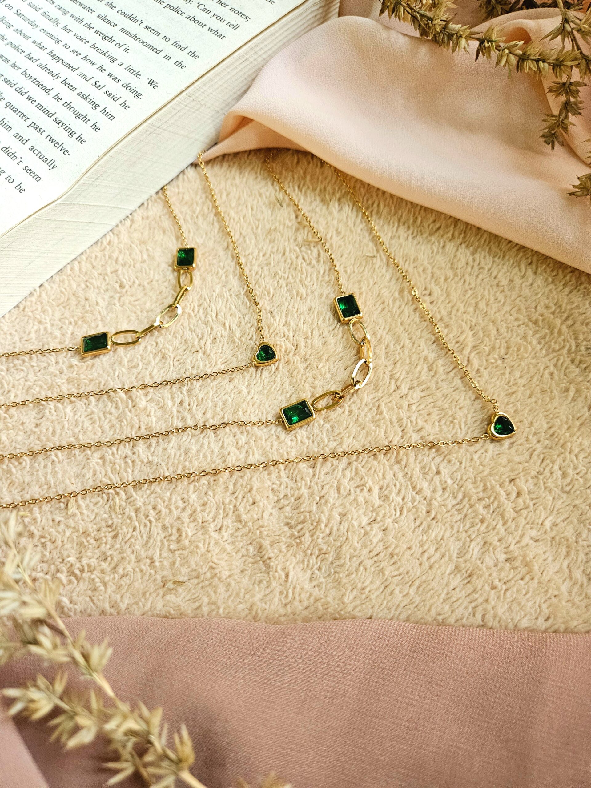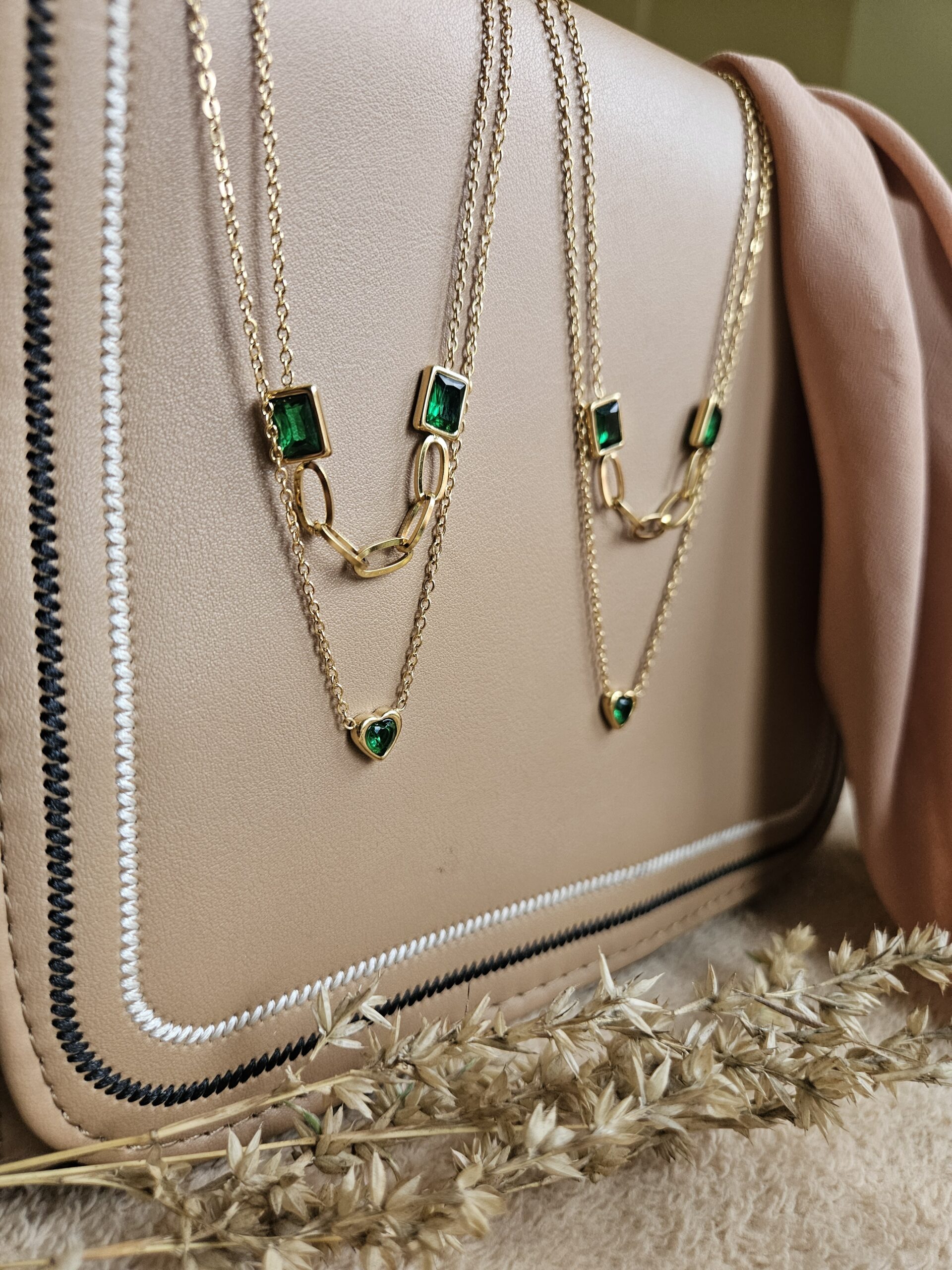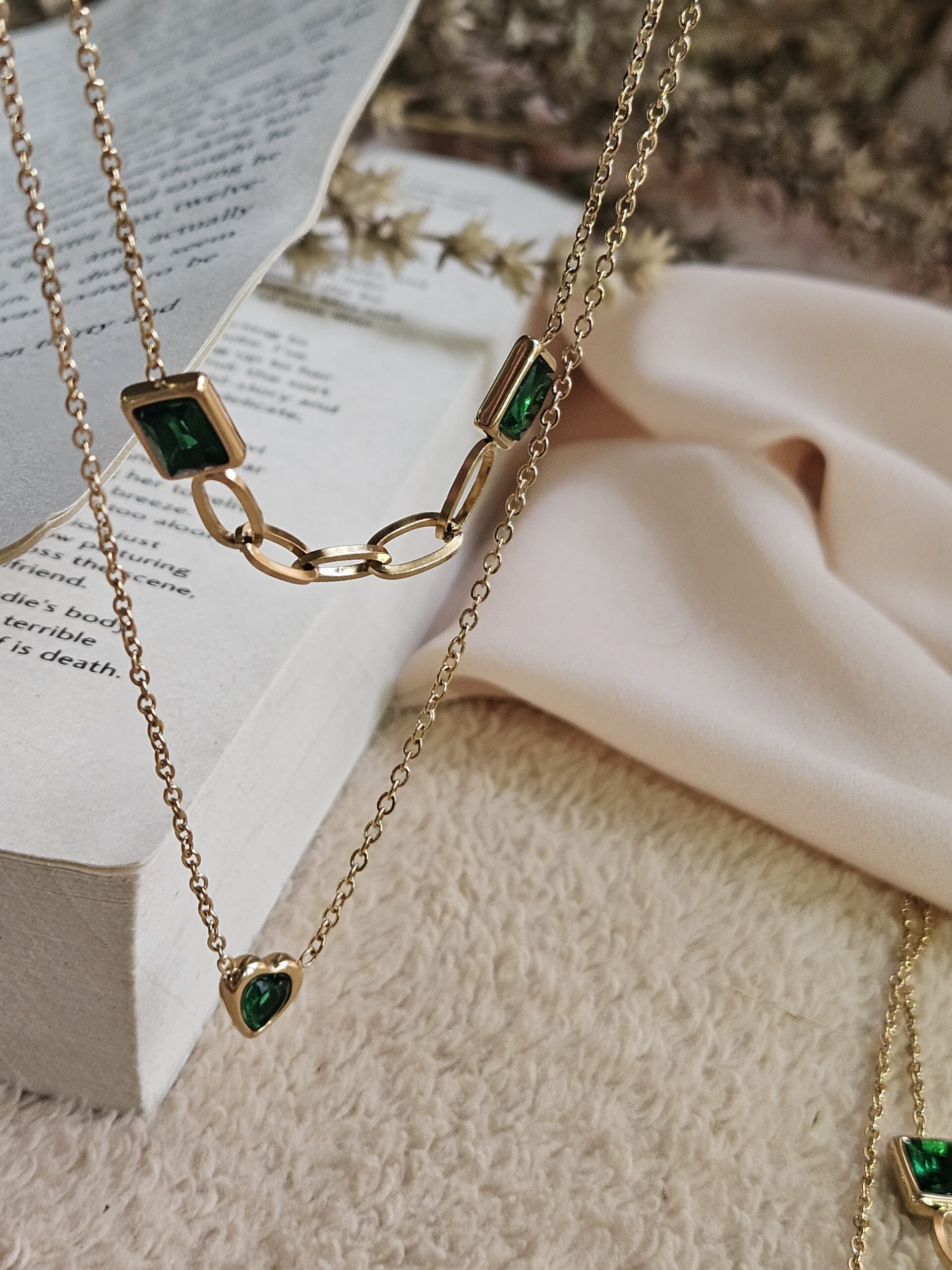 “Aura” is an elegant double-layer chain necklace featuring a vibrant green stone, crafted from premium 18k gold-plated demifine jewelry. Anti-tarnish, skin-friendly, and water & sweatproof for lasting beauty.