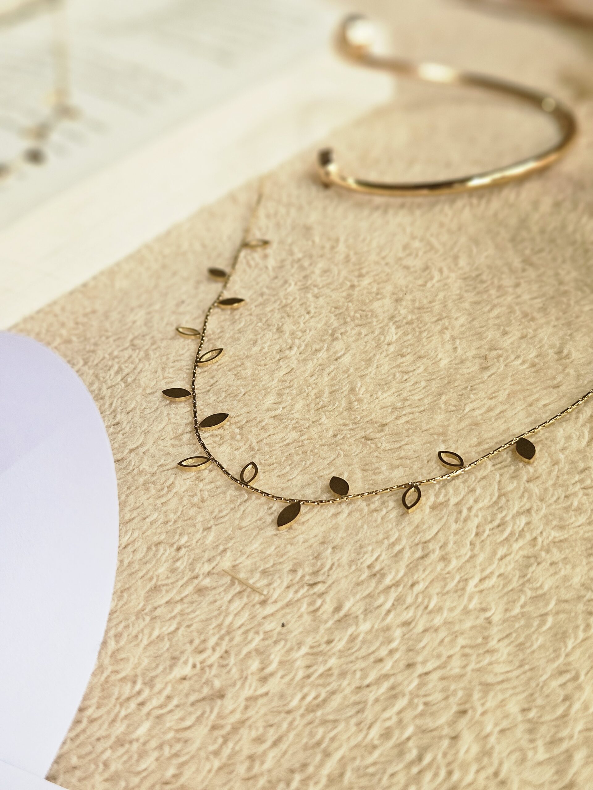 This is a sophisticated necklace that brings the beauty of nature into an elegant design. Featuring intricate golden leaves suspended on a delicate chain, this piece exudes timeless charm and refinement. Made from premium 18k gold-plated demifine jewelry, it offers both durability and luxurious shine. The necklace is designed with anti-tarnish, skin-friendly, and water & sweatproof properties, ensuring it retains its beauty and comfort over time. With a non-fading finish, “Golden Canopy” remains a stunning addition to any collection, perfect for elevating both casual and formal looks.
