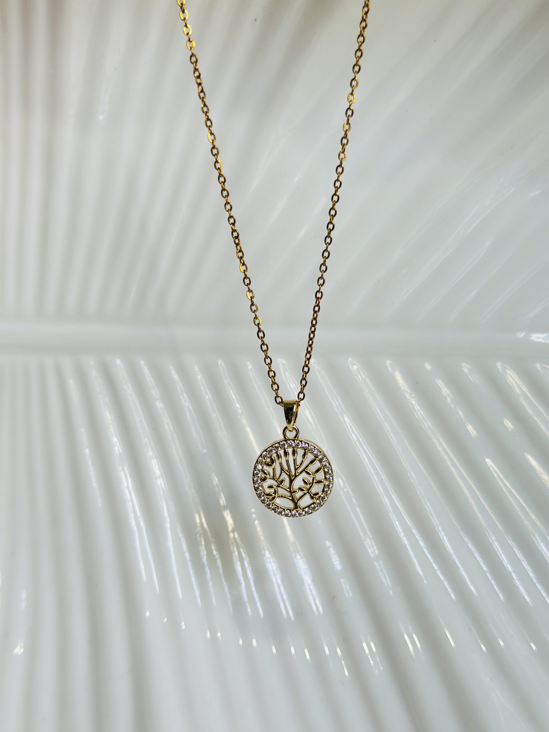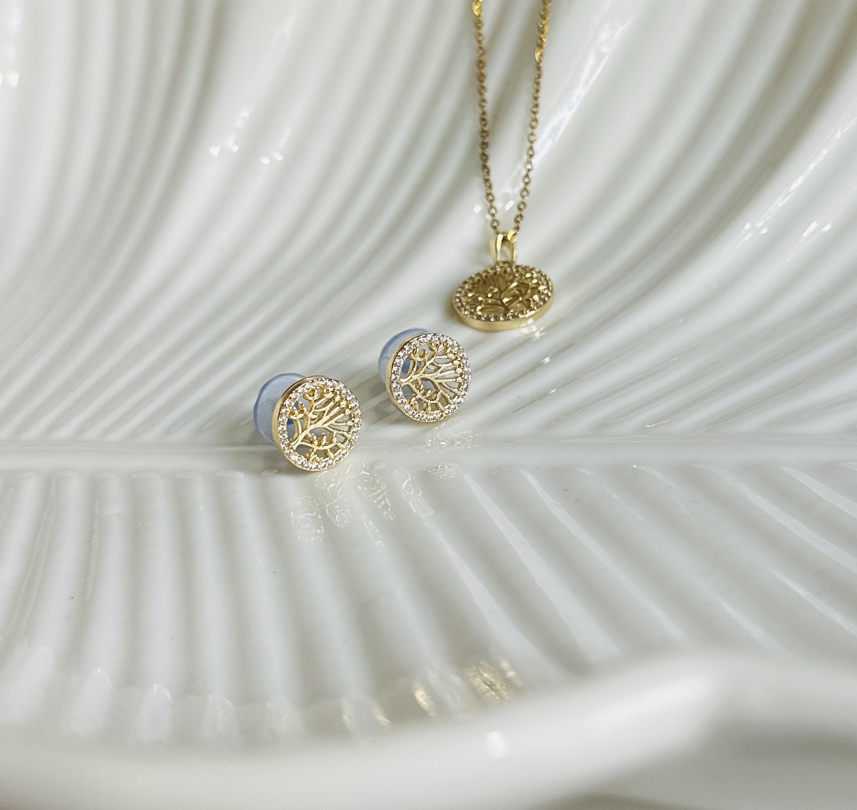 Unveil a symbol of timeless connection with our exquisite Aurora Arbor Pendant & Earring Set. The center stage is the pendant—a finely wrought disc of golden metal with openwork branches that reach outward in graceful symmetry, echoing life, growth, and harmony. It hangs from a slender, polished chain that catches the light gently, framing your neckline with soft radiance.