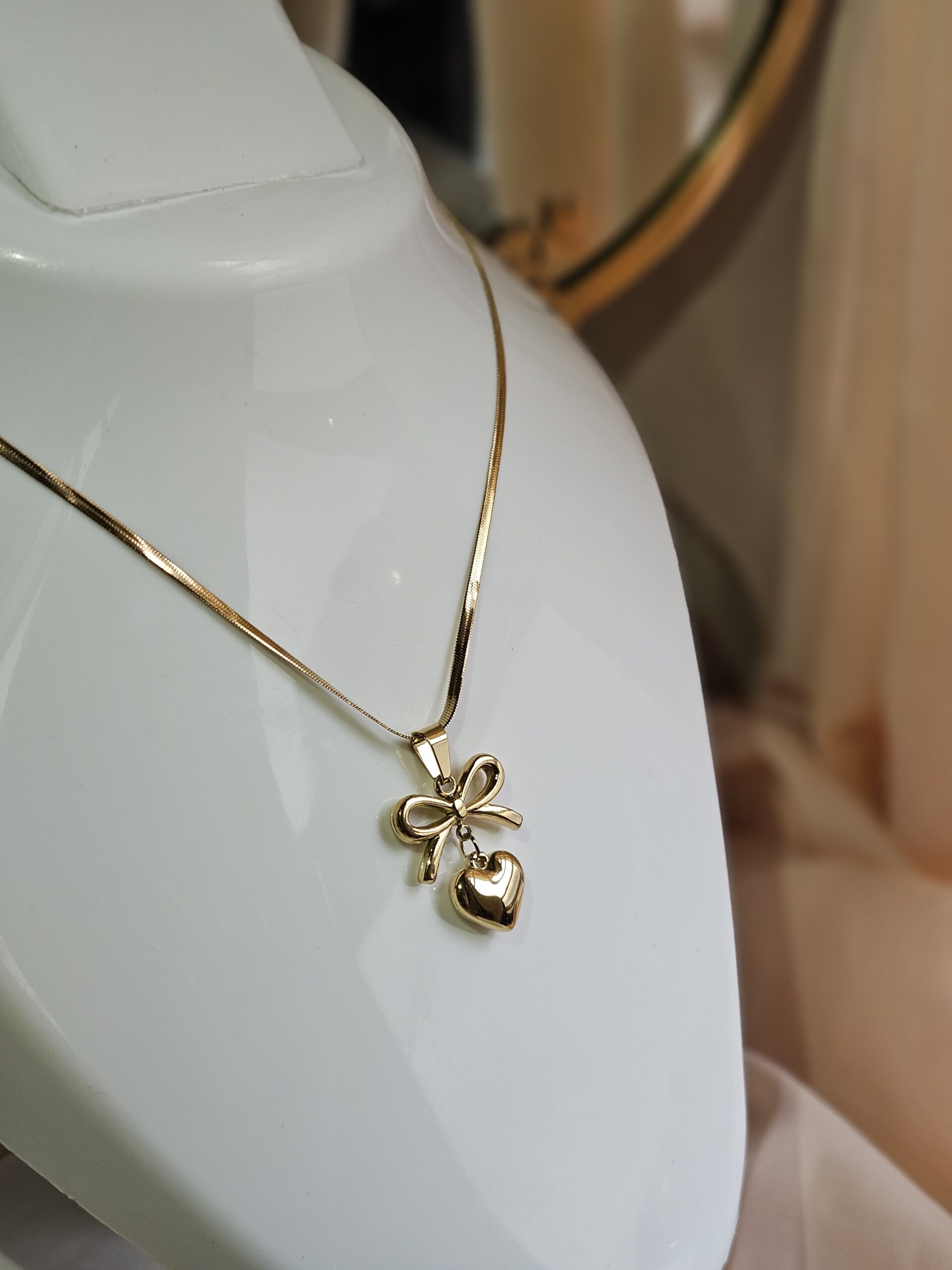 “Heartfelt Elegance” blends a delicate bow with a heart-shaped locket, crafted from premium 18k gold-plated demi fine jewelry. Anti-tarnish, skin-friendly, and water & sweat proof for lasting beauty and comfort.