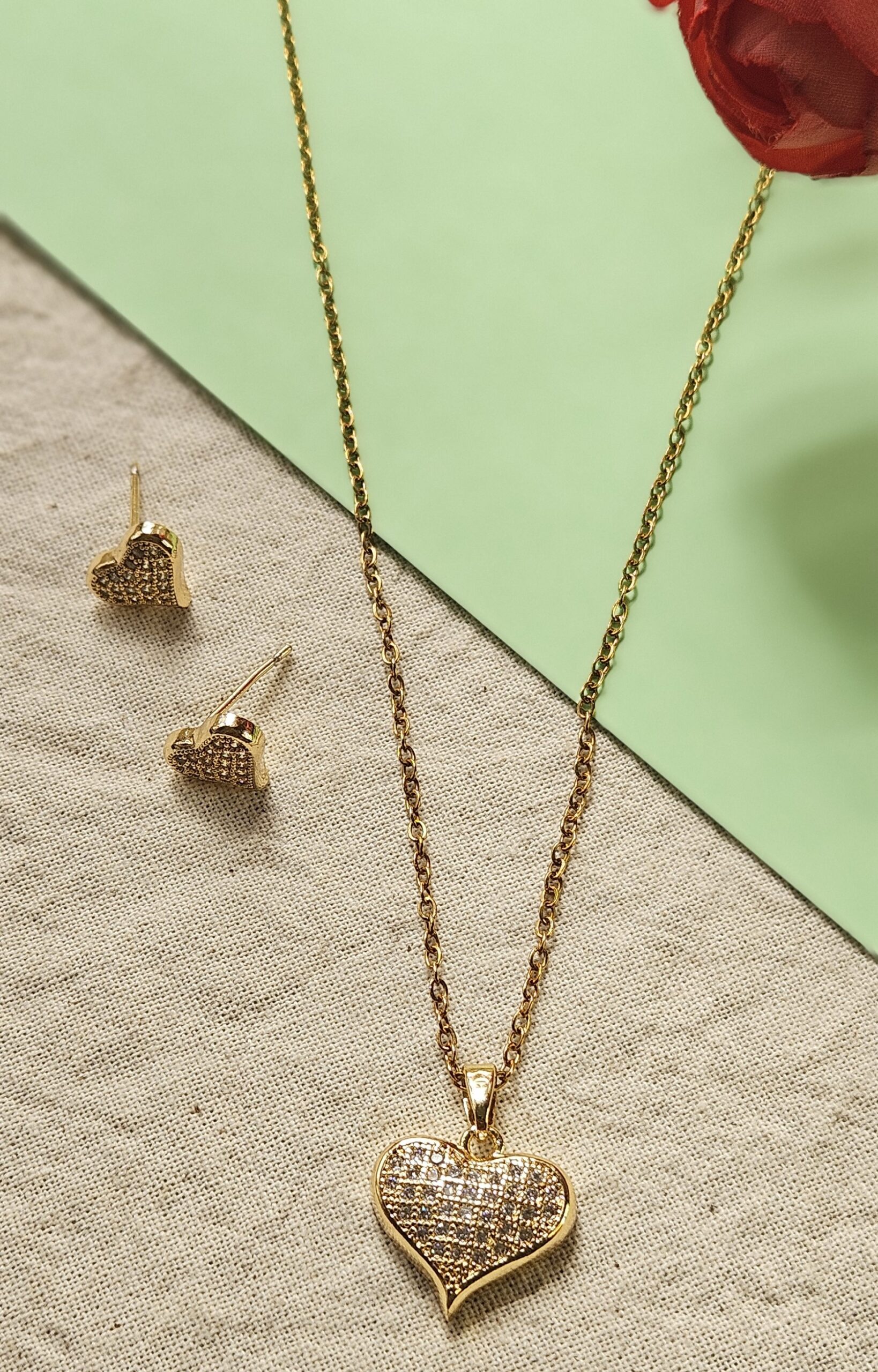 Sparkling Love – 18K Gold Plated Heart Pendant & Earring Set with AD Stone, Anti-Tarnish & Skin-Friendly