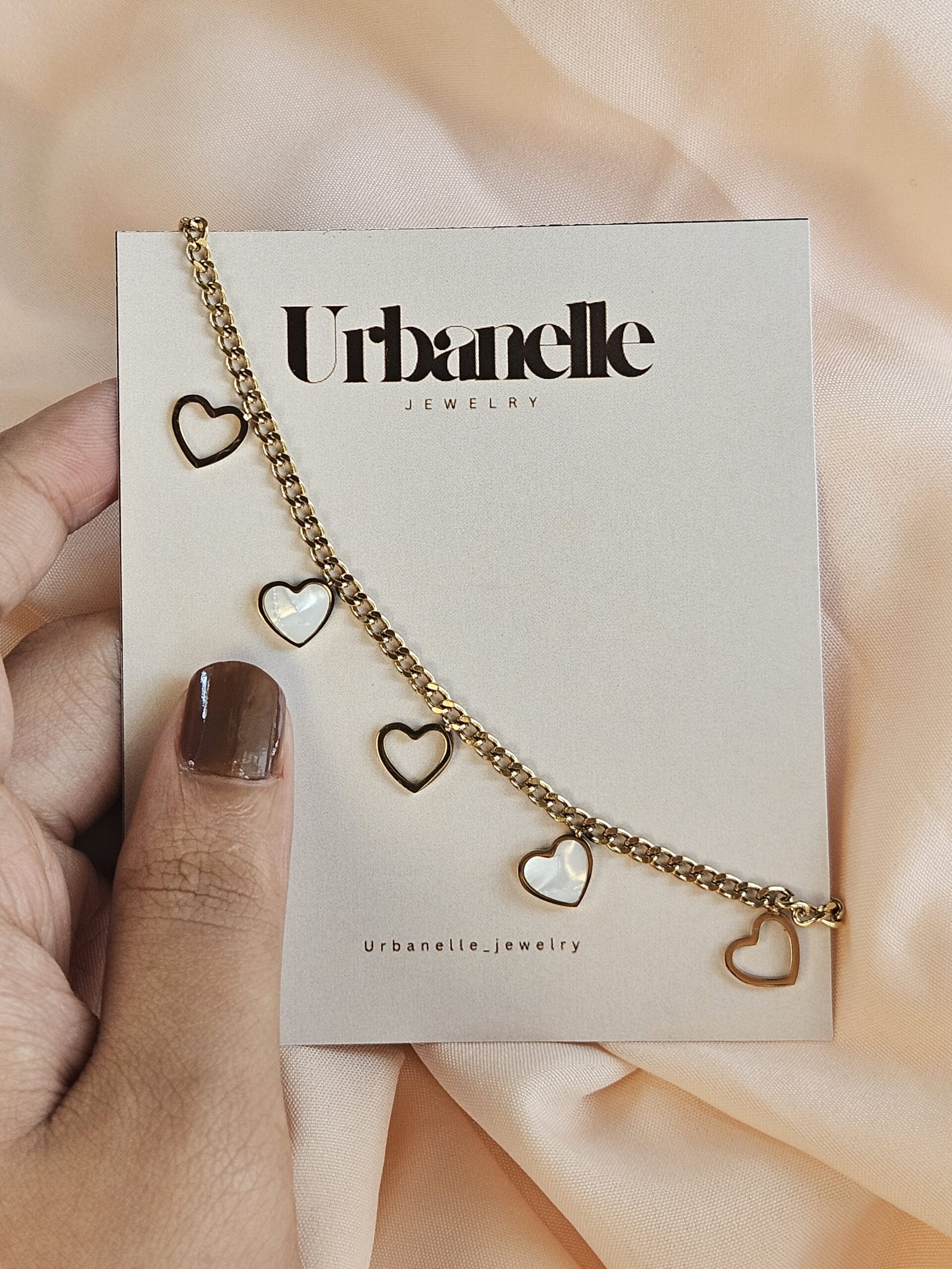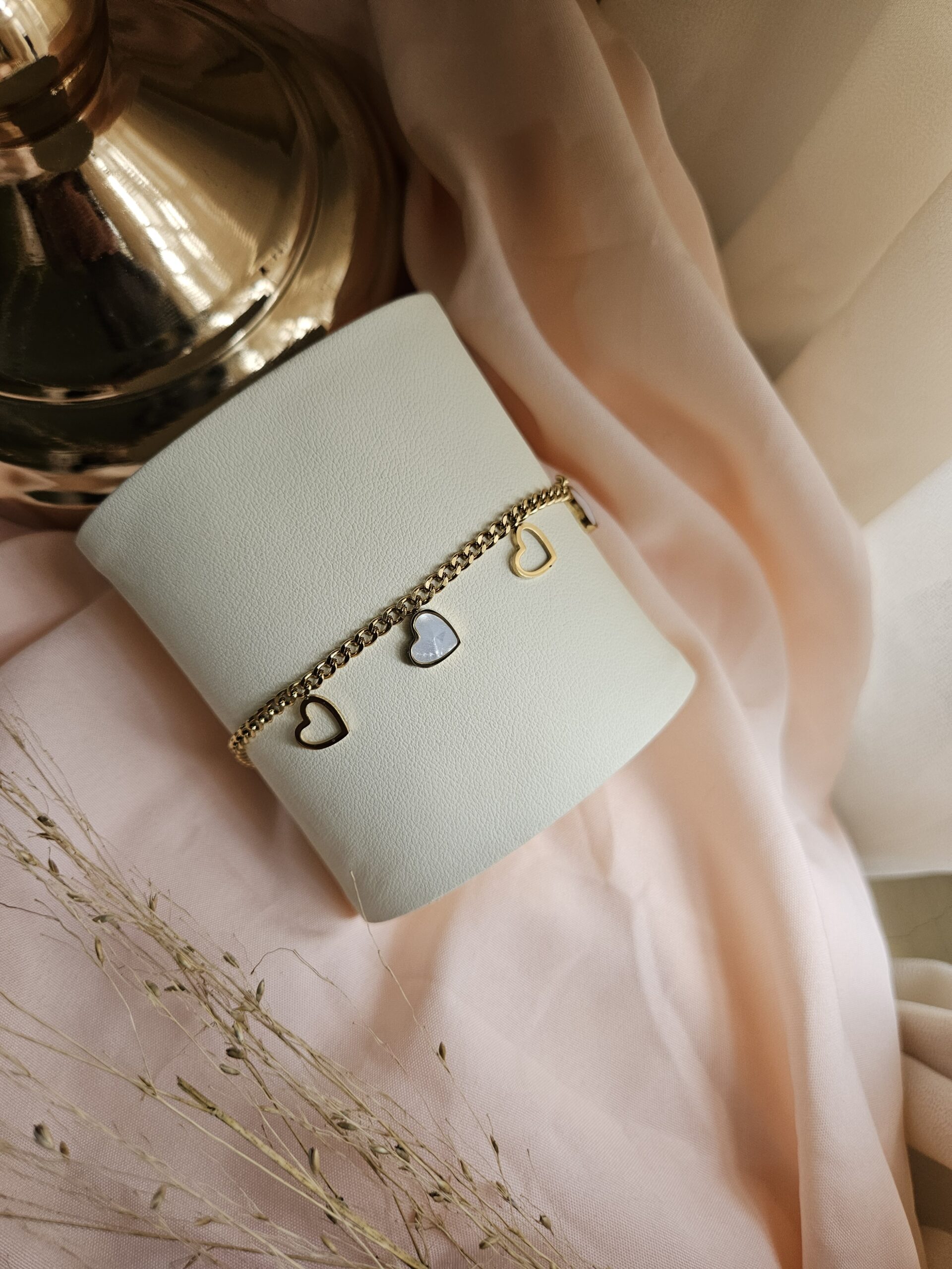 A charming 18K gold-plated bracelet featuring multiple heart-shaped charms, adding a playful and elegant touch to your style. Water-resistant, sweatproof, hypoallergenic, and tarnish-resistant for everyday wear.