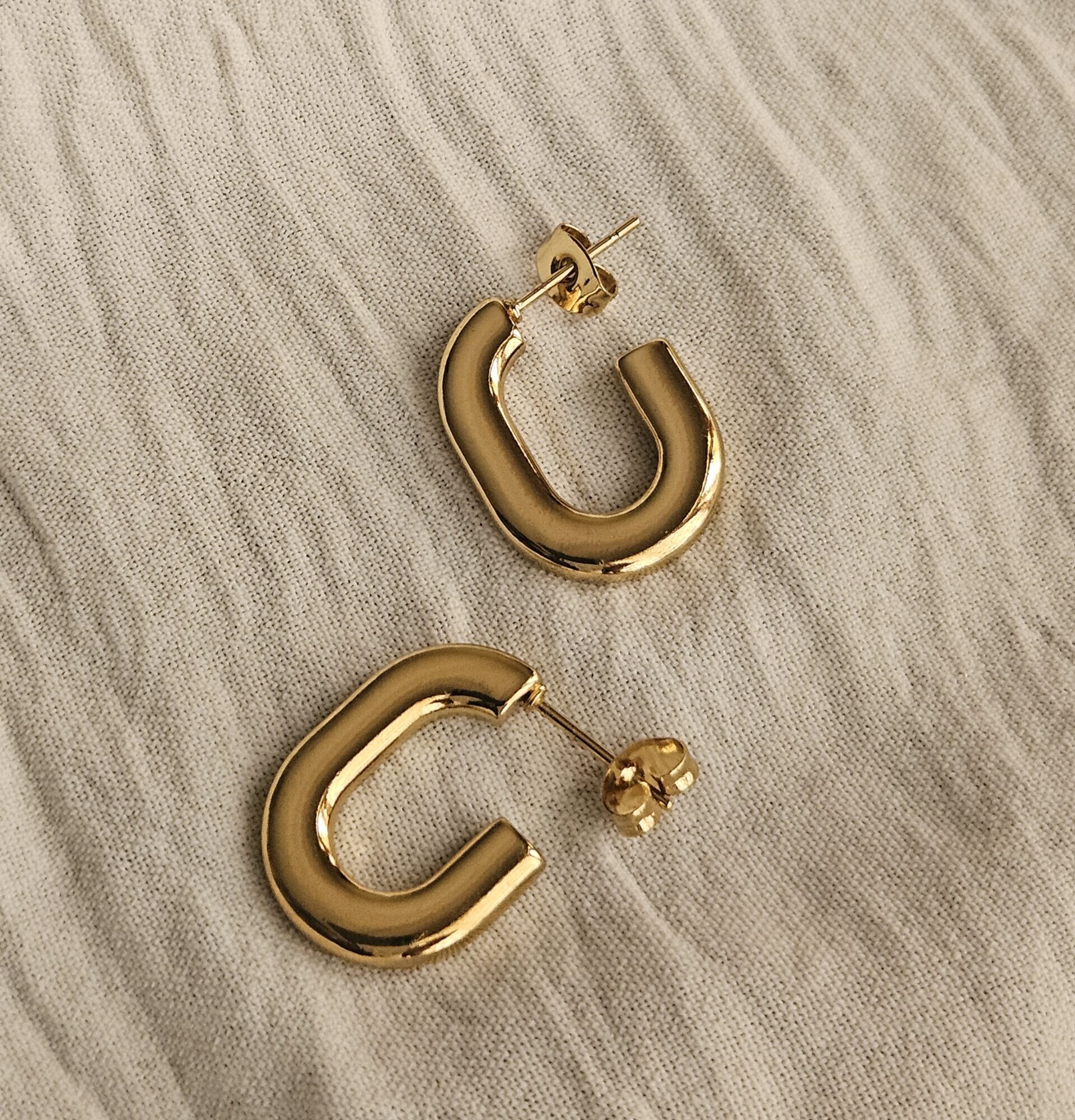 These premium 18K gold-plated earrings bring a contemporary edge to your jewelry collection. Their unique, sleek design offers an effortlessly chic look, perfect for elevating both casual and formal outfits. Built for durability and beauty, these earrings are water-resistant, sweatproof, hypoallergenic, and tarnish-resistant, ensuring they maintain their luster and quality over time. Designed with comfort in mind, they are ideal for all-day wear, especially for those with sensitive skin. A must-have for anyone seeking timeless style with modern flair.