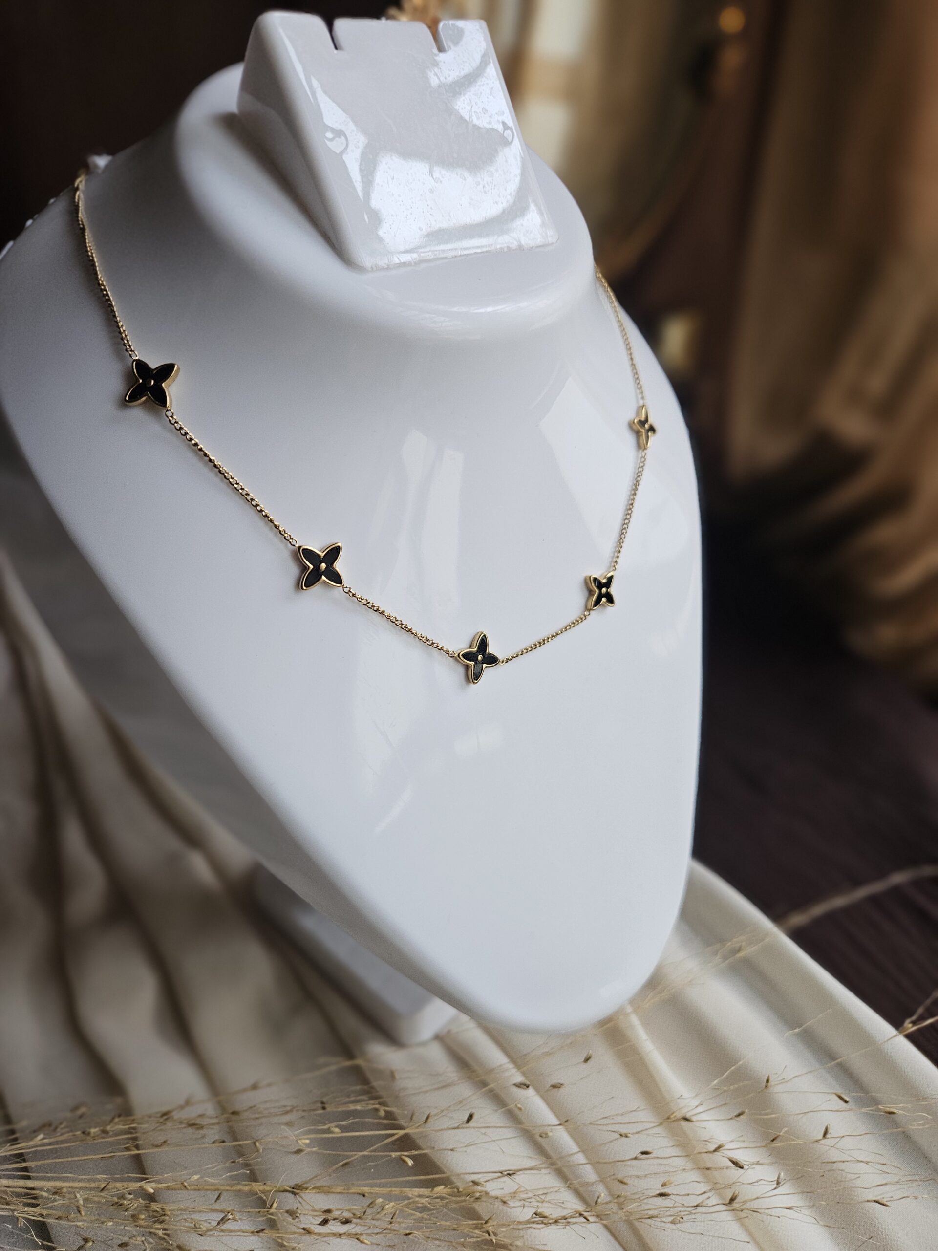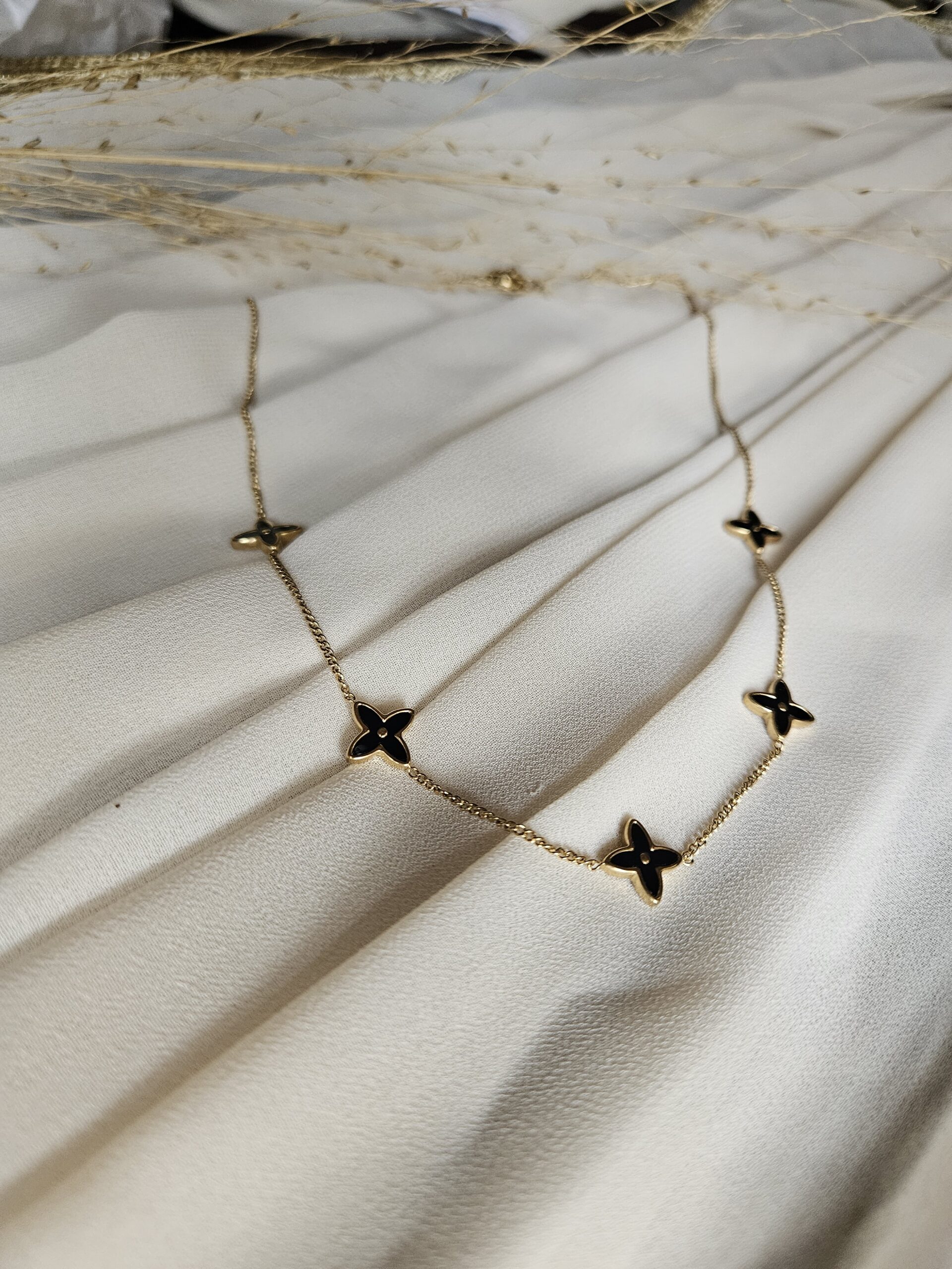 This is a statement piece that exudes sophistication and mystery. Crafted from premium 18k gold-plated demi fine jewelry, this design features multiple delicate elements, each with a striking black enamel finish that adds depth and allure. With anti-tarnish properties, skin-friendly materials, and water & sweat proof durability, this piece is built to endure while maintaining its beauty. The non-fading finish ensures that this accessory stays vibrant and captivating for years, making it the perfect companion for any occasion that calls for elegance with a touch of intrigue.