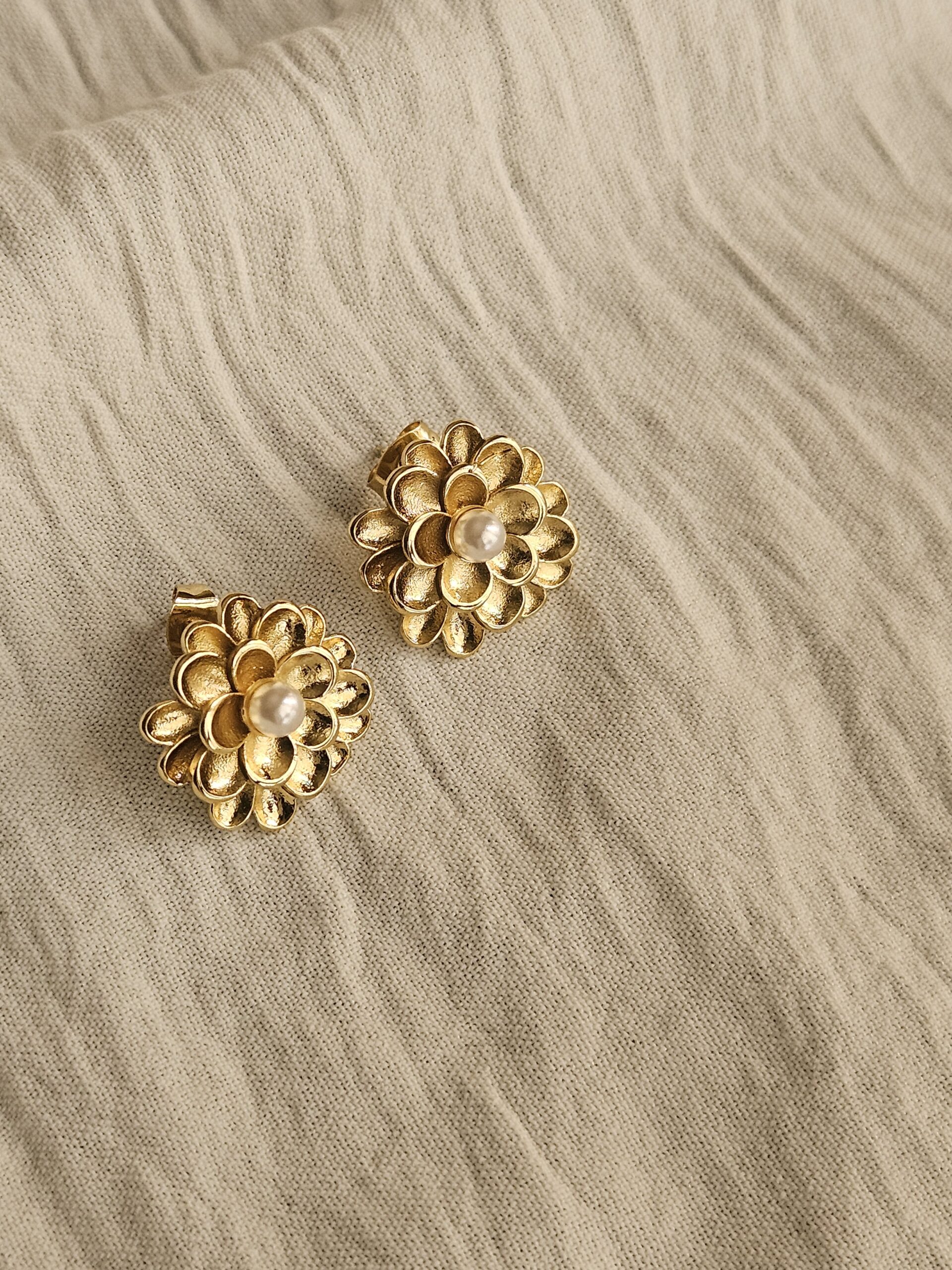 These elegant stud earrings feature a lustrous pearl at the center, plated with 18K gold. Designed for everyday elegance, they are water-resistant, sweat proof, hypoallergenic, and tarnish-resistant.