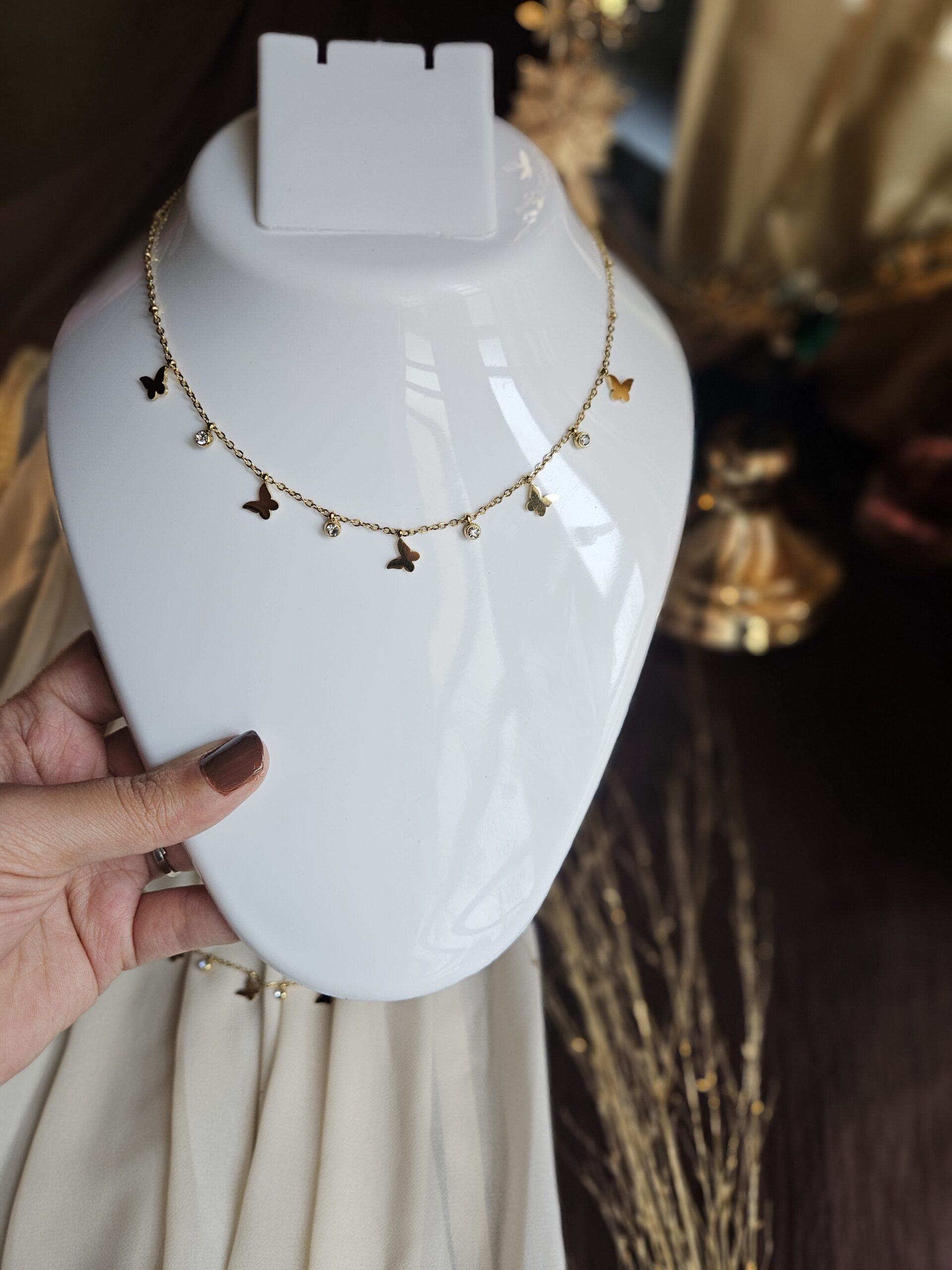 Regal charms is a symbol of grace and sophistication, seamlessly blending delicate butterfly motifs with the ethereal glow of opalescent stones. The necklace features alternating butterfly charms and radiant stones, creating a harmonious dance of light and elegance. Crafted from premium 18k gold-plated demifine jewelry, this piece exudes both luxury and durability. Designed to resist tarnishing, it is skin-friendly, water & sweatproof, and retains its brilliance over time. With a non-fading finish, “Opal Wings” is an enchanting addition to any collection, perfect for adding a touch of refinement to both everyday and special occasions.