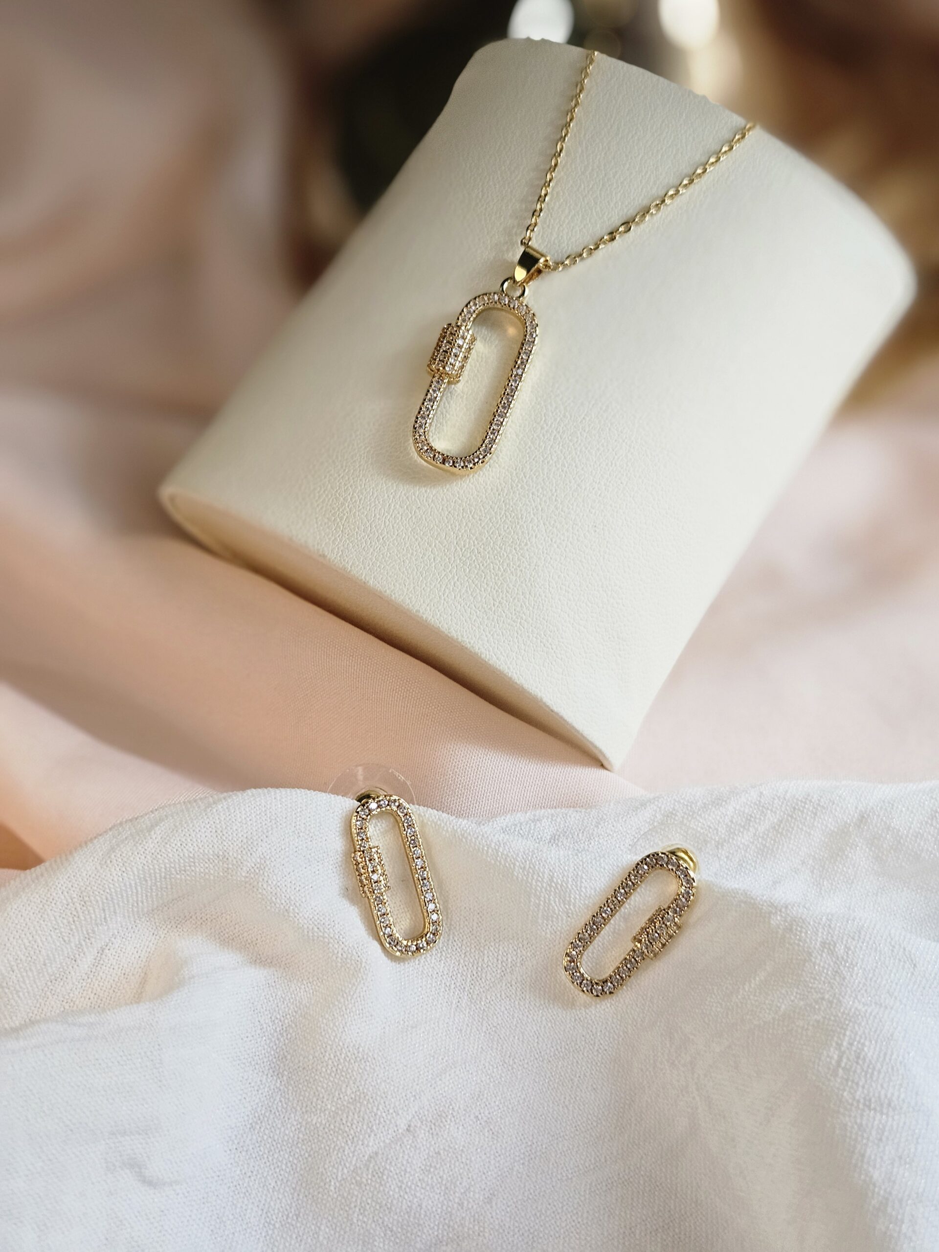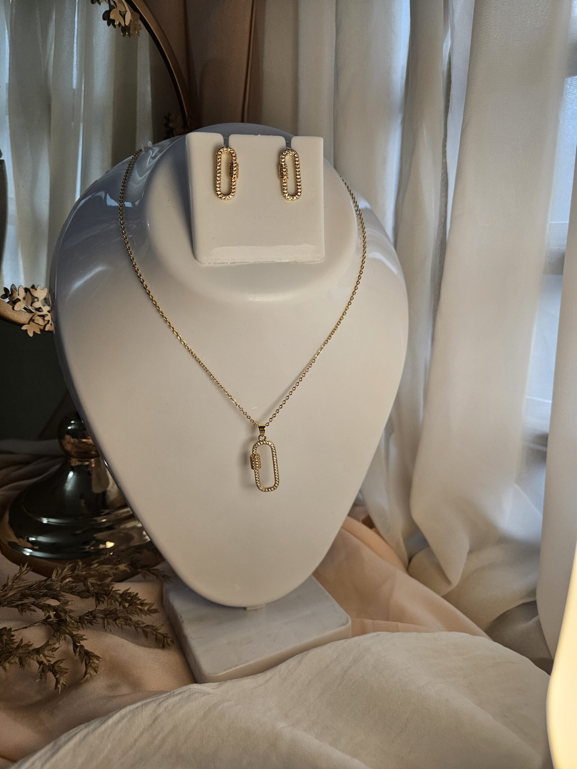This stunning necklace and earring set features a beautifully coordinated design, perfect for adding a touch of elegance to any outfit. The necklace features a delicate chain with a pendant that complements the matching earrings, creating a cohesive and polished look. Crafted with attention to detail, the pendant adds a subtle, sophisticated touch, while the earrings offer just the right amount of sparkle. Made with high-quality materials, this set is both lightweight and durable, ensuring comfort and long-lasting wear. Ideal for formal occasions or elevating your everyday look, this necklace and earring set adds the perfect finishing touch to your jewelry collection.